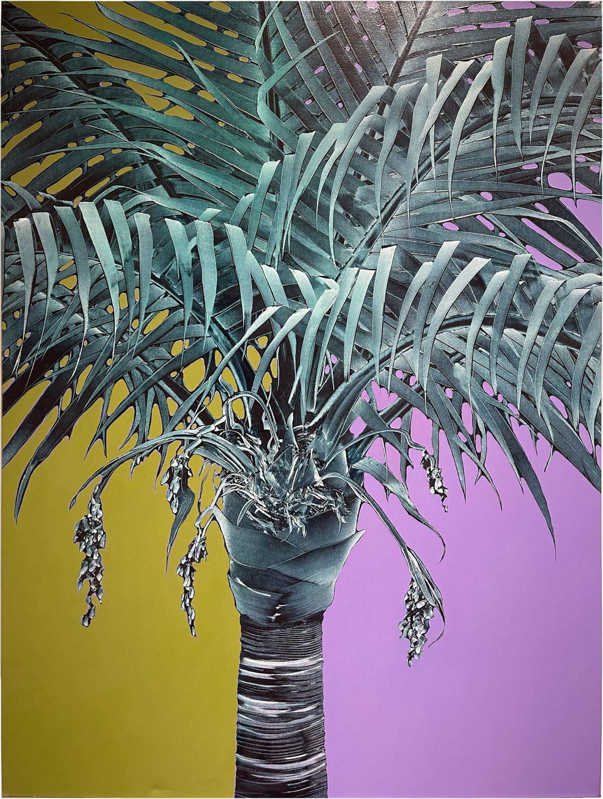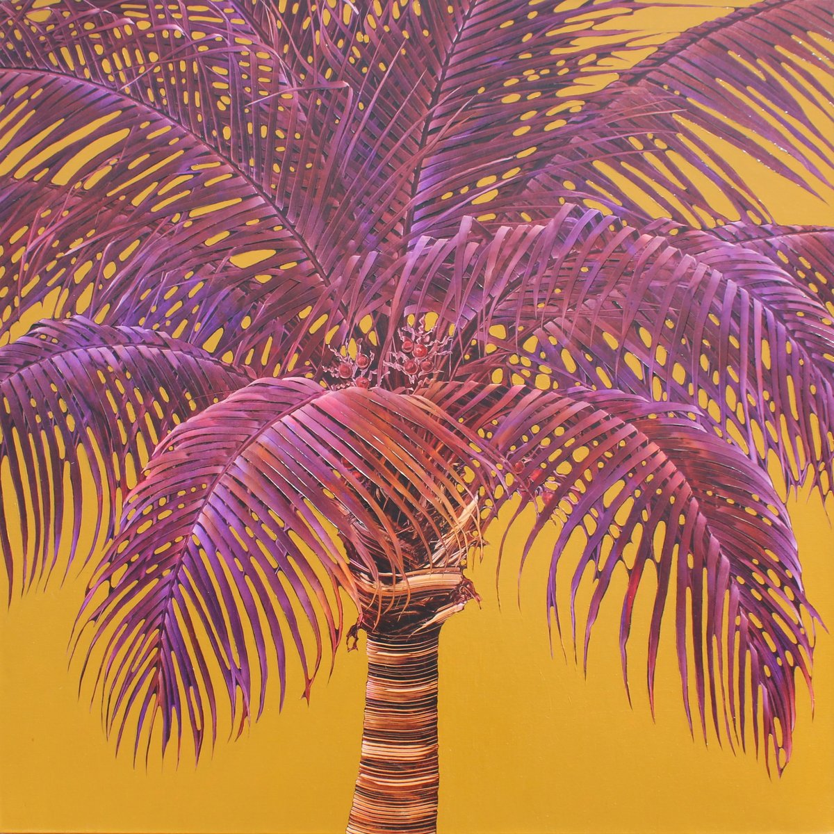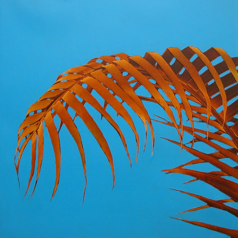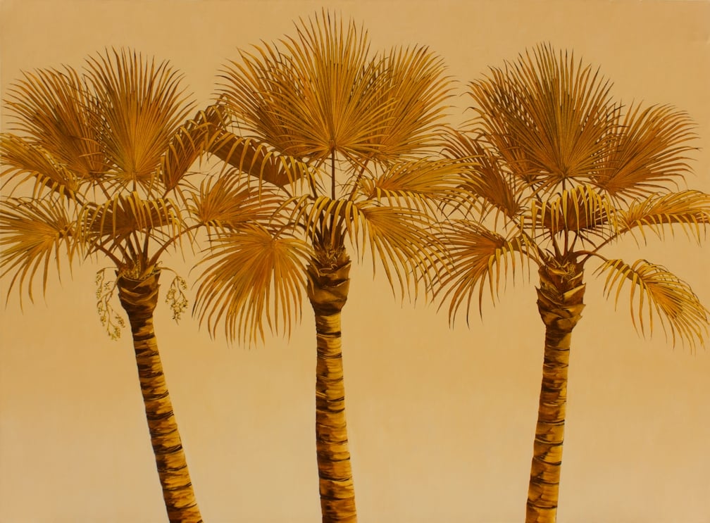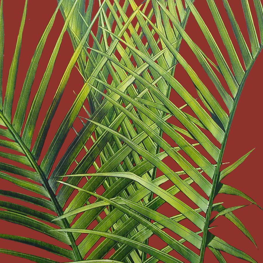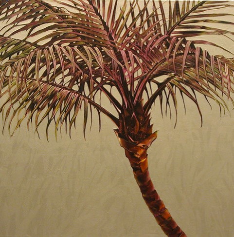 “I am drawn to the palm for its strong positive symbolism. For most of us, palm trees are an important element in the landscape of our perfect vacation. They are a simple reminder that life is good. In these paintings, I use color to enhance the exotic-ness that is already inherent in palm trees. The “face to face” composition provides the viewer with an intimate opportunity to observe the palm tree much as they would a portrait of a person. By replacing traditional references to landscape with a solid color background, the palm becomes iconic, transcending nature to become an alluring ideal palm. My goal is to engage the viewer in a way that allows them to experience the palm rather than to render a specific tree.”