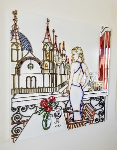 The experiences while working with artists in their variety of mediums strengthened Auen’s desire to create art that conveys messages utilizing reflective finishes and acrylic paints.