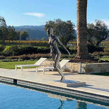 Private collectors often wait several months to receive one of his sought-after sculptures. While he has many different concepts, the “disappearing” sculptures strike a particularly deep chord as the most popular part of his oeuvre. They were conceived when Voss-Andreae imagined himself as the mathematical object that describes the dynamics of the buckyball particle in his graduate research, otherwise conjured as a human being moving through space and time in the most basic motion available to us, namely walking, in analogy to the particle in the laboratory, envisioned by Max Planck as a vibrating entity itself, whose vibration gives rise to the wave motion of quantum physics. The wave fronts that define the mathematical structure of the wave function are envisioned as evenly spaced slabs of steel in his analogy and the idea for his “disappearing sculptures” was born . Built in slices of marine grade stainless steel, the most industrial, cold, and harsh material in art, Voss-Andreae depicts the soft human form in a way that depending on the viewer’s perspective, appear solid, or virtually disappear. Born from within the current paradigm of reductionist-materialist science, Voss-Andreae uses the rich metaphorical potential in this approach to reveal the underlying nature of reality as holistic and deeply spiritual.