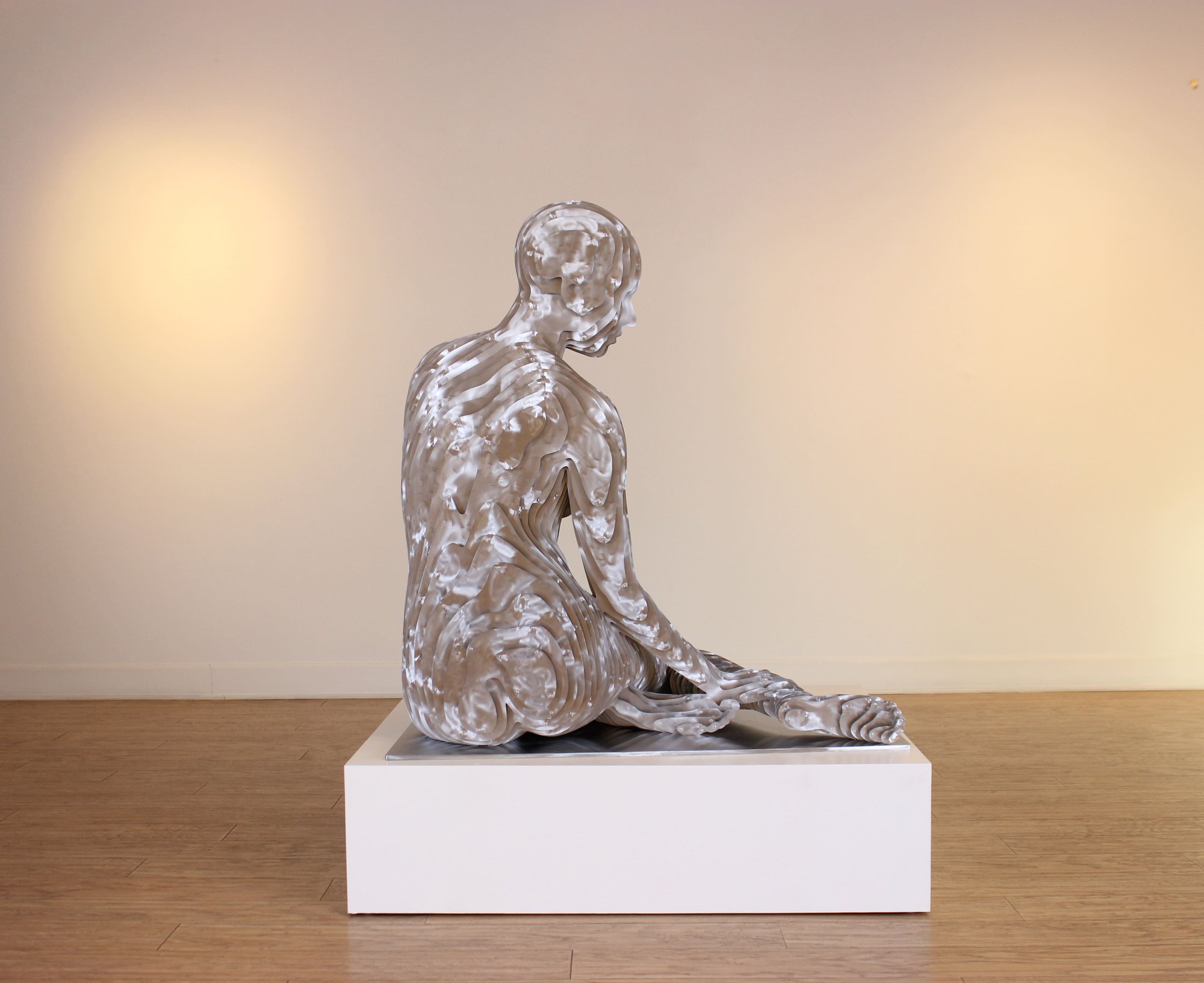 While Voss-Andreae’s sculptures are inspired by a diversity of fascinating concepts and themes, his “disappearing” sculptures strike a particularly deep chord. They were conceived when Voss-Andreae imagined himself in the place of the buckyball particle of his graduate research. Just like the internal oscillatory energy of the particle, first described by Planck and Einstein, gives rise to the wave function of quantum physics, he envisioned the rhythmic motion of the human gait giving rise to the same mathematical structure. Visualizing the wave fronts of the wave function as evenly spaced, parallel slabs of steel, the idea for his “light wave beings”, or “disappearing sculptures,” was born. Built in slices of marine grade stainless steel, the most industrial and cold material in art, Voss-Andreae depicts the soft and warm human form in a way that, depending on the viewer’s perspective, appears solid or virtually disappears. Through his art, Voss-Andreae succeeds in metaphorically transcending the classical reductionist-materialist paradigm to reveal the underlying nature of reality as holistic and deeply spiritual.