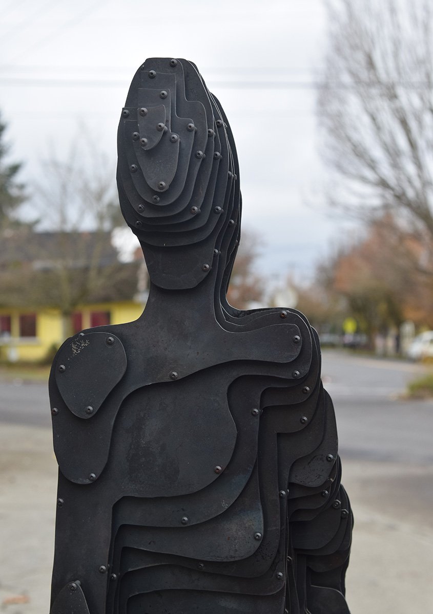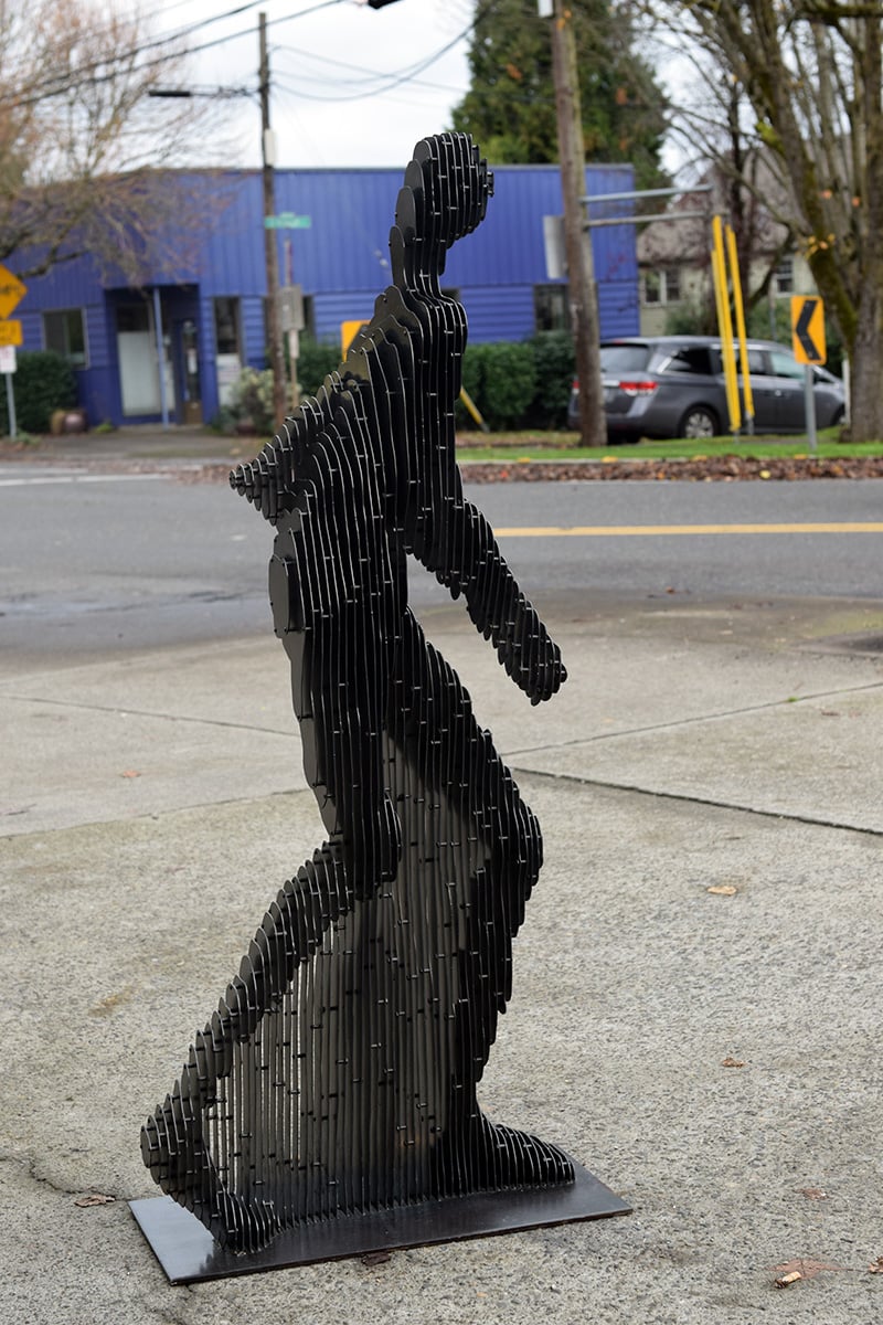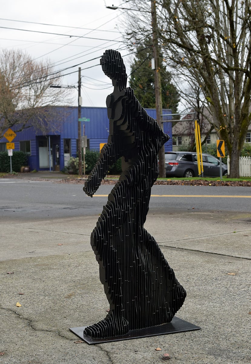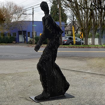 While Voss-Andreae’s sculptures are inspired by a diversity of fascinating concepts and themes, his “disappearing” sculptures strike a particularly deep chord. They were conceived when Voss-Andreae imagined himself in the place of the buckyball particle of his graduate research. Just like the internal oscillatory energy of the particle, first described by Planck and Einstein, gives rise to the wave function of quantum physics, he envisioned the rhythmic motion of the human gait giving rise to the same mathematical structure. Visualizing the wave fronts of the wave function as evenly spaced, parallel slabs of steel, the idea for his “light wave beings”, or “disappearing sculptures,” was born. Built in slices of marine grade stainless steel, the most industrial and cold material in art, Voss-Andreae depicts the soft and warm human form in a way that, depending on the viewer’s perspective, appears solid or virtually disappears. Through his art, Voss-Andreae succeeds in metaphorically transcending the classical reductionist-materialist paradigm to reveal the underlying nature of reality as holistic and deeply spiritual.