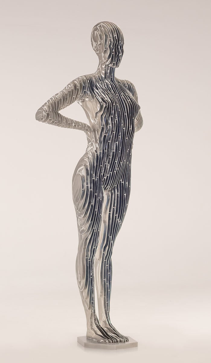 While Voss-Andreae’s sculptures are inspired by a diversity of fascinating concepts and themes, his “disappearing” sculptures strike a particularly deep chord. They were conceived when Voss-Andreae imagined himself in the place of the buckyball particle of his graduate research. Just like the internal oscillatory energy of the particle, first described by Planck and Einstein, gives rise to the wave function of quantum physics, he envisioned the rhythmic motion of the human gait giving rise to the same mathematical structure. Visualizing the wave fronts of the wave function as evenly spaced, parallel slabs of steel, the idea for his “light wave beings”, or “disappearing sculptures,” was born. Built in slices of marine grade stainless steel, the most industrial and cold material in art, Voss-Andreae depicts the soft and warm human form in a way that, depending on the viewer’s perspective, appears solid or virtually disappears. Through his art, Voss-Andreae succeeds in metaphorically transcending the classical reductionist-materialist paradigm to reveal the underlying nature of reality as holistic and deeply spiritual.